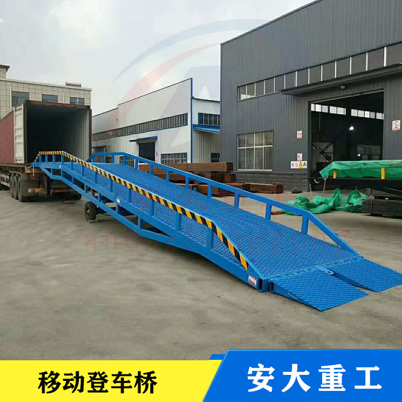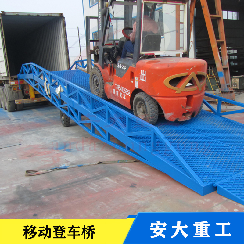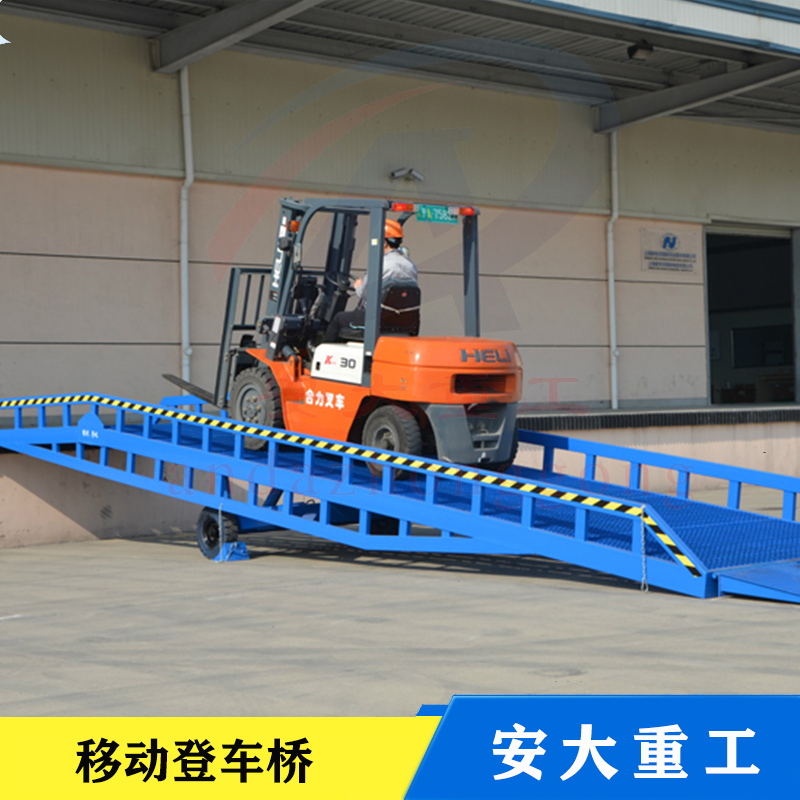 移動式登車橋是與叉車配合使用的貨物裝卸輔助沒備,可根據汽車車用的高低調節高度,叉車可以直接通過本設備駛入車廂內部進行貨物的批量裝卸,需單人作業,即可實現貨物的快速裝卸。它使企業減少大量勞動力,提高工作效率,獲取經濟效益。