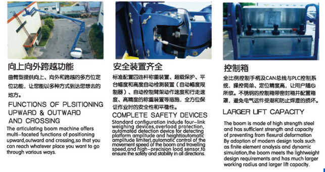 自行曲臂式高空作業(yè)平臺動力分為柴油發(fā)動機(jī)型、直流馬達(dá)型,升降臂有二節(jié)、三節(jié)、升降高度從10米至32米、所有機(jī)型全高度行走、曲臂延伸升降、轉(zhuǎn)盤360旋轉(zhuǎn)。不同機(jī)型配備不同的動力源,以適應(yīng)室內(nèi)室外的不同要求。使用柴油機(jī)或者蓄電池動力驅(qū)動,配合有效的幾何設(shè)計和超長的跨越半徑,使該款機(jī)型可以有效地避開棘手的障礙物作業(yè)。緊湊的工業(yè)設(shè)計底盤,優(yōu)異的原地零尾擺旋轉(zhuǎn)能力,因此低于20米的自行曲臂式升降作業(yè)平臺能在有限的空間靈活操作。自行曲臂式升降作業(yè)平臺是您維修、安裝、修剪等高空作業(yè)的理想工具。